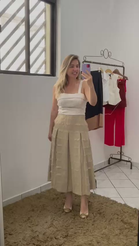 Saia midi confeccionada em viscose, com caimento encorpado. Possui cós reto e pregas fêmea, que se prolongam em seu comprimento, alongando a silhueta feminina. Fechamento na lateral com zíper invisível. Seu diferencial fica no tecido com franjas em xadrez, proporcionando uma peça exclusiva e única, transmitindo feminilidade e um look sofisticado para a mulher.